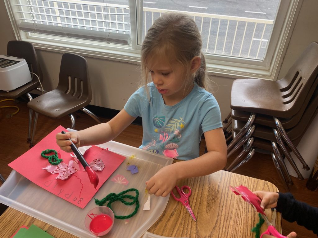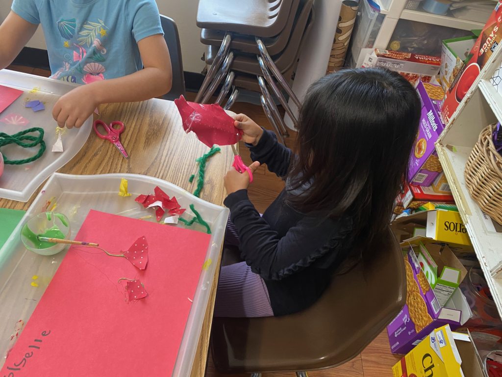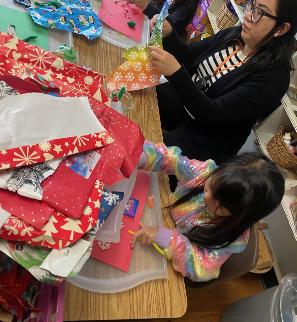 After our book exchange, children reused the wrapping paper to create colorful collages. Tearing, cutting, and gluing strengthened fine motor skills while encouraging creativity and conversations about reusing materials in meaningful ways.